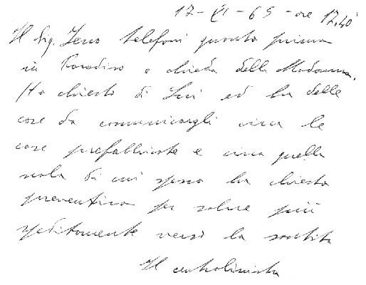 1 Il Sig. Zeno telefoni quanto prima in Paradiso e chieda della Madonna. Ha chiesto di Lui ed ha delle cose da comunicargli circa le case prefabbricate e circa quella scala di cui spesso ha chiesto preventivo per salire più speditamente verso la santità.Il centralinista