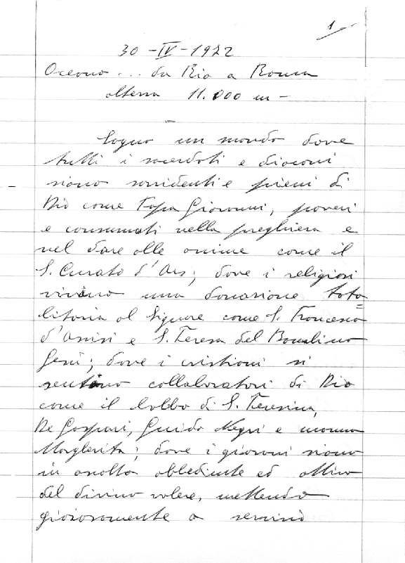 È una effusione spirituale, scritta in aereo mentre viaggiava da Rio de Janeiro a Roma il 29.4.1972 di ritorno dall’ultimo viaggio in America Latina, con la quale don Ottorino ribadisce il suo ideale di apostolo. Si conserva il testo originale: sono due paginette di un quaderno a righe che don Ottorino usava negli ultimi mesi della sua vita (Q 23, p. 31-34), numerate, scritte con penna biro su ambedue le facciate della prima e su quella anteriore della seconda. La data indicata da don Ottorino (30.IV.1972) non è esatta, perché il volo giunse a Roma il 29 aprile 1972.