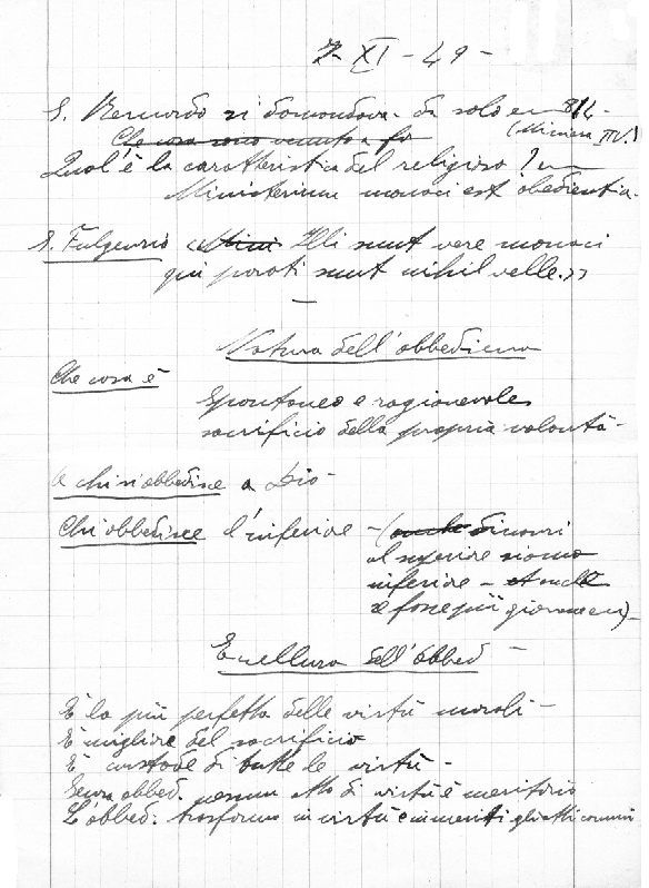 S. Bernardo si domandava da solo: Qual è la caratteristica del religioso? “Ministerium monaci est oboedientia”. S. Fulgenzio: “Illi sunt vere monaci qui parati sunt nihil velle”. Natura dell’obbedienza. Che cosa è: spontaneo e ragionevole sacrificio della propria volontà. A chi si obbedisce: a Dio. Chi obbedisce: l’inferiore (dinanzi al superiore siamo inferiori, anche se fosse più giovane…). Eccellenza dell’obbedienza. È la più perfetta delle virtù morali. È migliore del sacrificio. È custode di tutte le virtù. Senza obbedienza nessun atto di virtù è meritorio. L’obbedienza trasforma in atti di virtù e in meriti gli atti comuni.