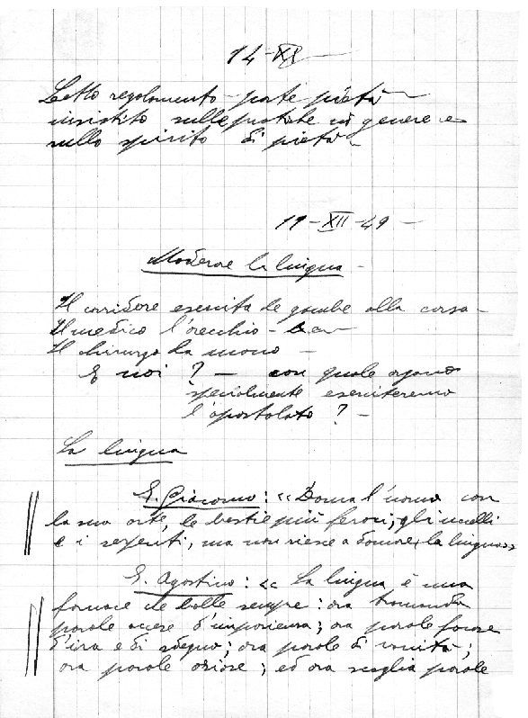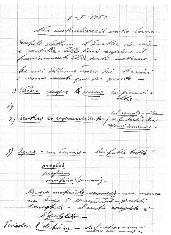 Centrale elettrica: il direttore, che vede e controlla, dalle luci capisce il funzionamento delle parti interne. Ora noi dobbiamo essere dei tecnici e siamo venuti qui per questo. 1) Vedere sempre anime: quelle dei giovani e altre. 2) Sentire la responsabilità: al ‘roccolo’ il cacciatore fa silenzio; anche se si fa male, tace. Sapersi dominare. 3) Agire - non dormire - hai fatto tutto? sveglia, preghiera, sacrificio (permesso)… Lavoro materiale necessario, ma è un mezzo… Nei tempi di persecuzione, gli apostoli vanno travestiti. Il nostro compito è l’apostolato. Pericolosa l’abitudine: solo il mestiere, non si vedono più anime.