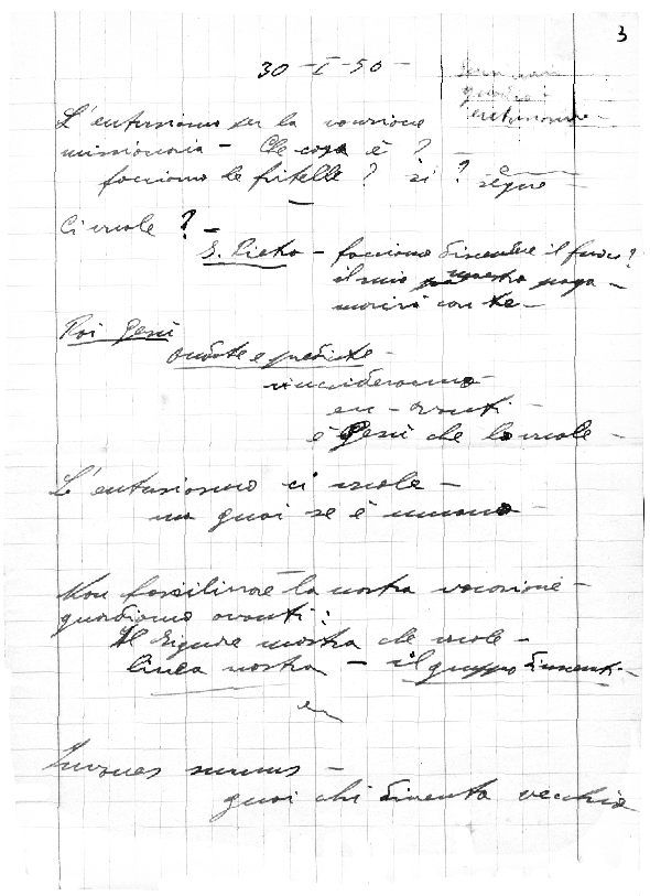 Si conserva il testo originale: sono tre fogli strappati da un quaderno a quadri, scritti a mano con inchiostro e con matita, con molte sottolineature e alcune correzioni.