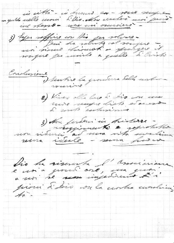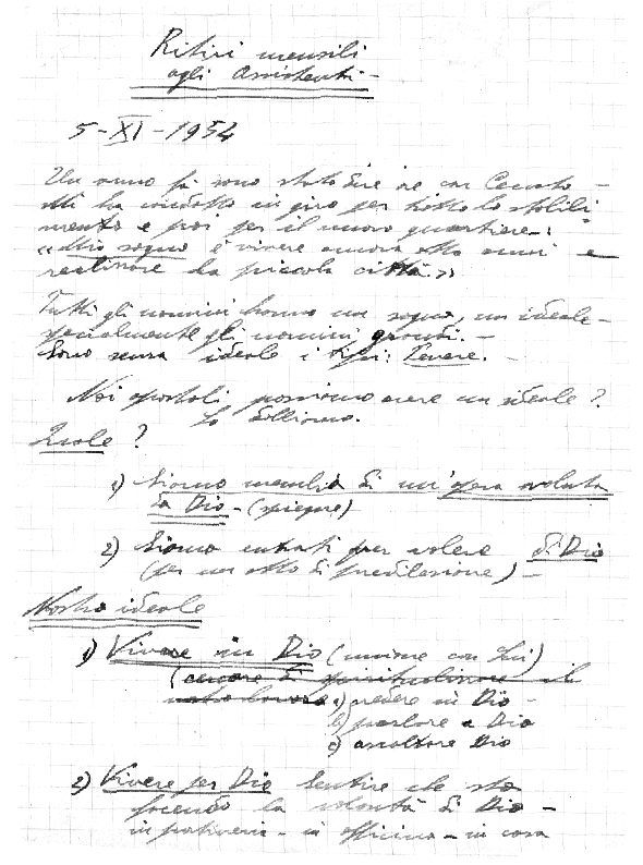 1 Un anno fa sono stato due ore con Ceccato. Mi ha condotto in giro per tutto lo stabilimento e poi per il nuovo quartiere: “Mio sogno è vivere ancora otto anni e realizzare la piccola città”. Tutti gli uomini hanno un sogno, un ideale, specialmente gli uomini grandi. Sono senza ideali tipi come Pevere... Noi apostoli possiamo avere un ideale? La dobbiamo avere. Quale? 1) Siamo membri di un’opera voluta da Dio (spiegare...). 2) Siamo entrati per volere di Dio, per un atto di predilezione. Nostro ideale: 1) Vivere in Dio (unione con Lui): a) credere in Dio b) parlare a Dio c) ascoltare Dio. 2) Vivere per Dio. Sentire che sto facendo la volontà di Dio: in portineria, in offcina, in casa, in città, in Duomo ecc...