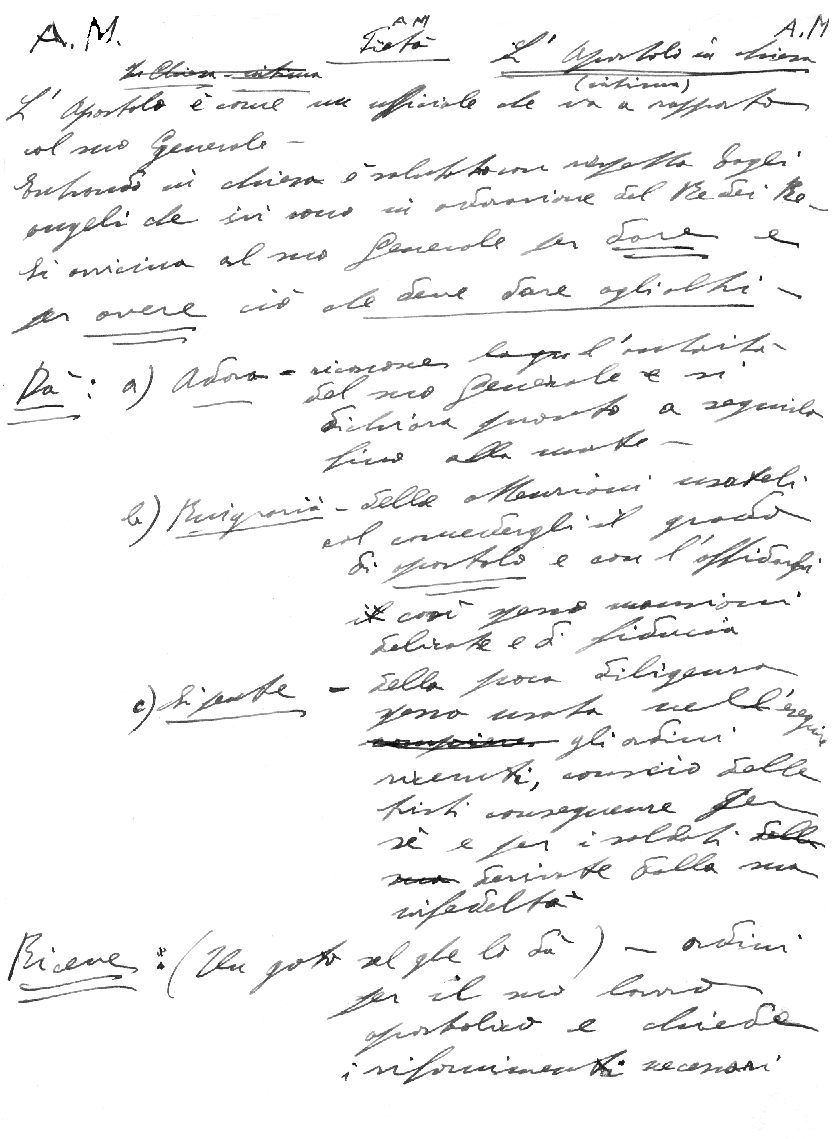 L’apostolo è come un ufficiale che va a rapporto con il suo Generale. Entrando in chiesa è salutato con rispetto dagli angeli che ivi sono in adorazione del Re dei re. Si avvicina al suo Generale per dare e per avere ciò che deve dare agli altri. Dà: a) Adora = riconosce l’autorità del suo Generale e si dichiara pronto a seguirlo fino alla morte. b) Ringrazia = delle attenzioni usategli nel concedergli il grado di apostolo e nell’affidargli così spesso mansioni delicate e di fiducia. c) Si pente = della poca diligenza spesso avuta nell’eseguire gli ordini ricevuti, conscio delle tristi conseguenze per sé e per gli altri soldati, dovute alla sua infedeltà. Riceve: - (un goto se ‘l ghe lo dà...) - ordini per il suo lavoro apostolico, e chiede i rifornimenti necessari.