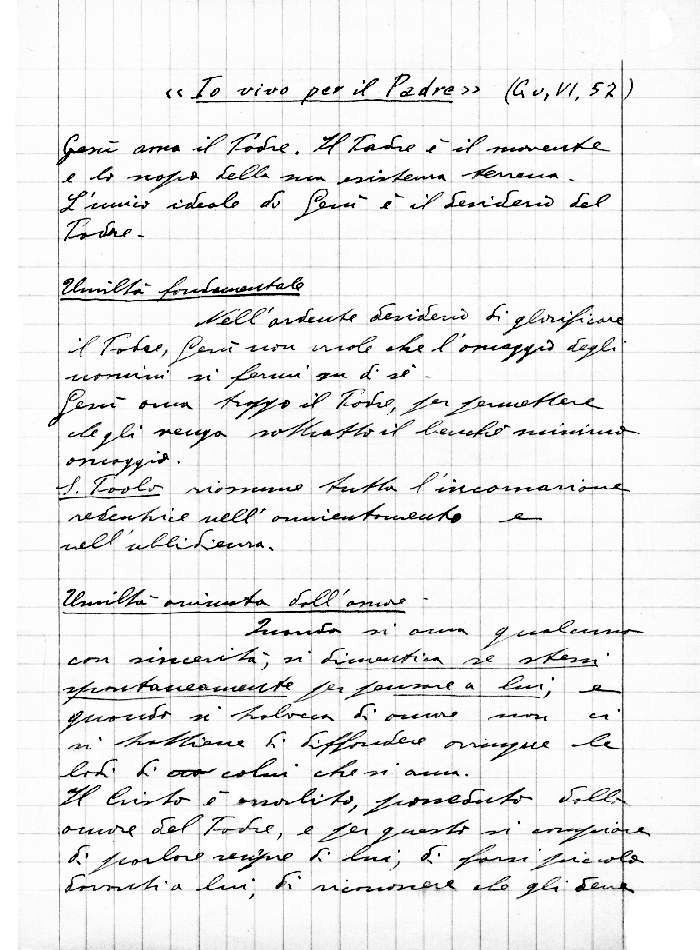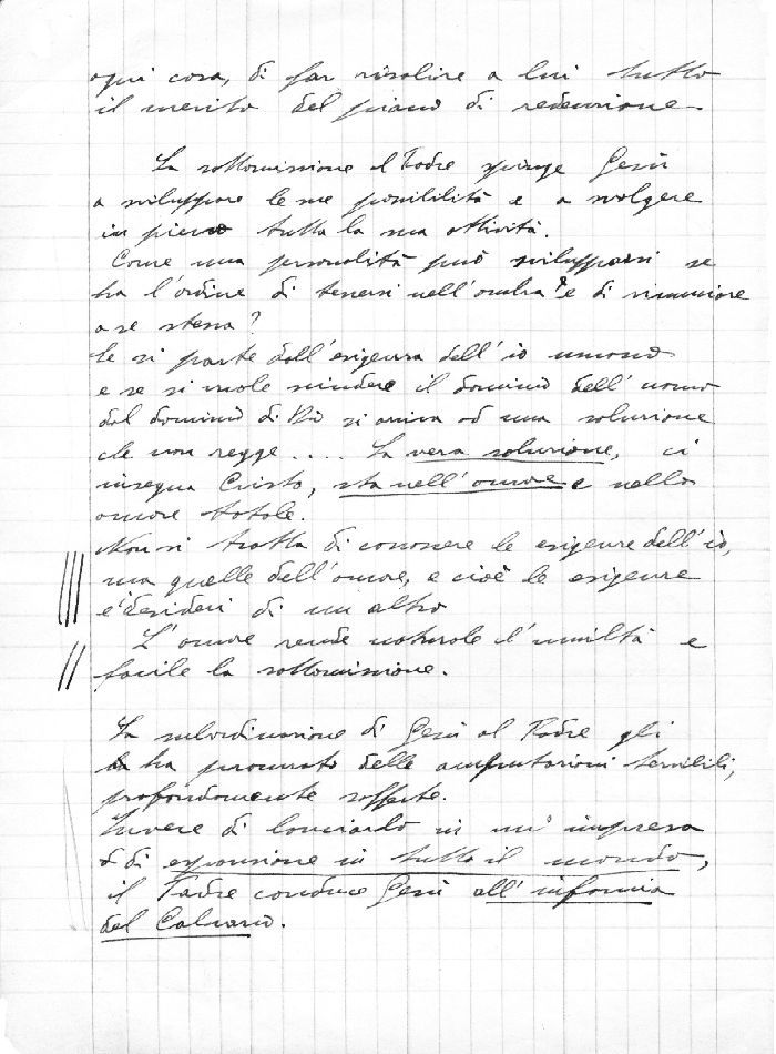Come una personalità può svilupparsi se ha l’ordine di tenersi nell’ombra e di rinunciare a se stessa? Se si parte dall’esigenza dell’io umano e se si vuole scindere il dominio dell’uomo dal dominio di Dio si arriva ad una soluzione che non regge... La vera soluzione, ci insegna Cristo, sta nell’amore e nell’amore totale. Non si tratta di conoscere le esigenze dell’io, ma quelle dell’amore, e cioè le esigenze e i desideri di un altro. L’amore rende naturale l’umiltà e facile la sottomissione. La subordinazione di Gesù al Padre gli ha procurato delle amputazioni terribili, profondamente sofferte. Invece di lanciarlo in un’impresa di espansione in tutto il mondo, il Padre conduce Gesù all’infamia del Calvario.