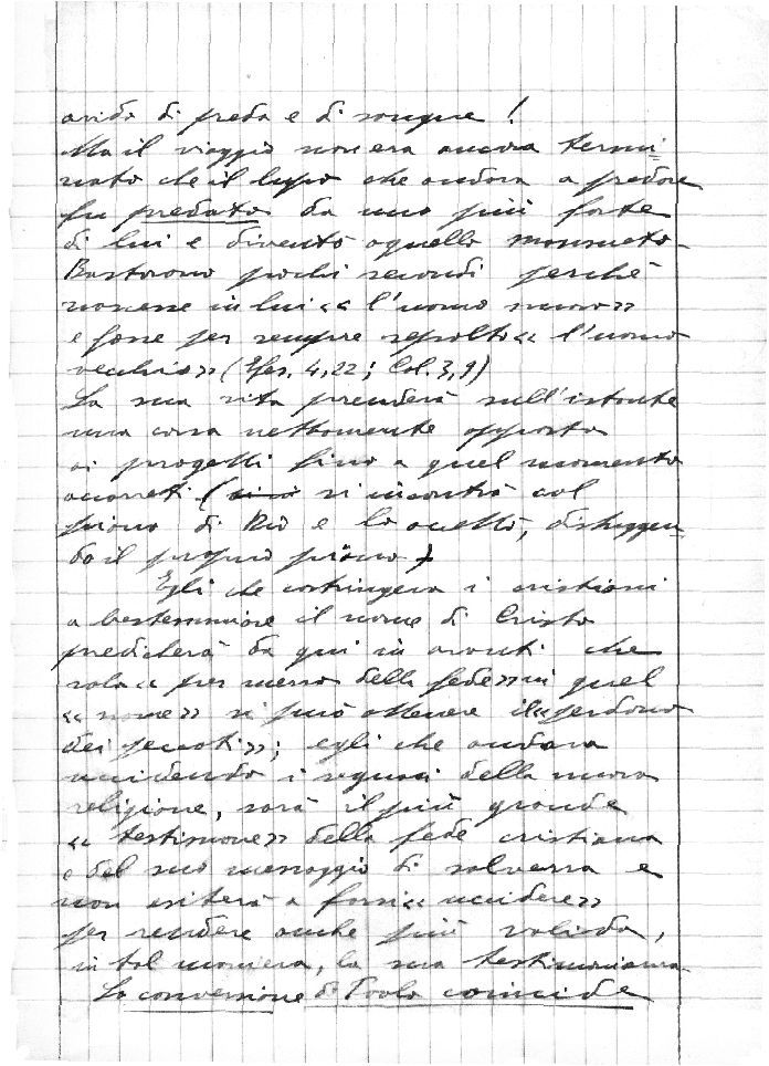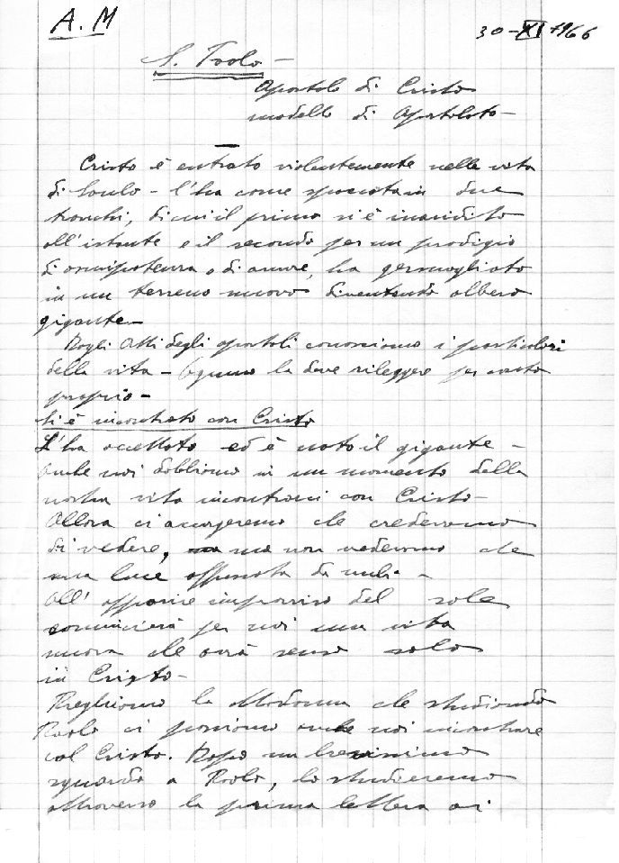 È la traccia di un ritiro spirituale mensile agli Assistenti dell’Istituto San Gaetano, tenuto il 30 novembre 1966, sulla figura dell’apostolo Paolo.