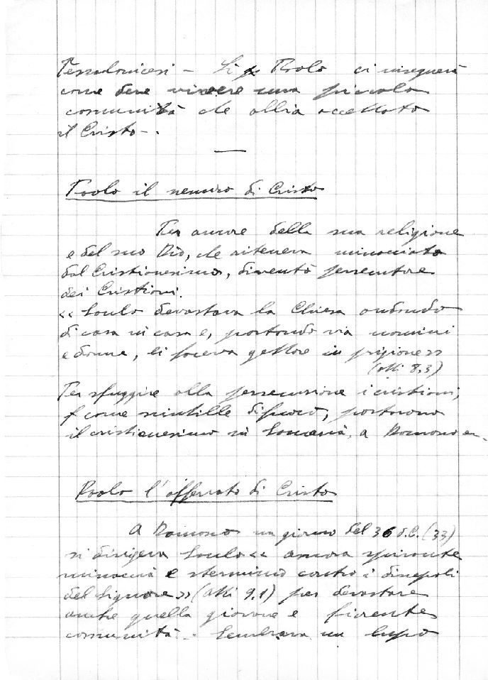Cristo è entrato violentemente nella vita di Saulo: l’ha come spaccata in due tronchi, di cui il primo si è inaridito all’istante e il secondo, per un prodigio di onnipotenza e di amore, ha germogliato in un terreno nuovo diventando albero gigante. Dagli Atti degli Apostoli conosciamo i particolari della vita. Ognuno la deve rileggere per conto proprio. Si è incontrato con Cristo L’ha accettato ed è nato il gigante. Anche noi dobbiamo in un momento della nostra vita incontrarci con Cristo. Allora ci accorgeremo che credevamo di vedere, ma non vedevamo che una luce offuscata da nubi. All’apparire improvviso del sole comincerà per noi una vita nuova che avrà senso solo in Cristo. Preghiamo la Madonna che studiando Paolo possiamo anche noi incontrarci con il Cristo. Dopo un brevissimo sguardo a Paolo, lo studieremo attraverso la prima lettera ai Tessalonicesi. Lì Paolo ci insegnerà come deve vivere una piccola comunità che abbia accettato il Cristo. Paolo, il nemico di Cristo Per amore della sua religione e del suo Dio, che riteneva minacciato dal Cristianesimo, diventò persecutore dei cristiani. “Saulo devastava la Chiesa andando di casa in casa e, portando via uomini e donne, li faceva gettare in prigione” (Atti 8,3). Per sfuggire alla persecuzione i cristiani, come scintille di fuoco, portarono il cristianesimo in Samaria, a Damasco, ecc.