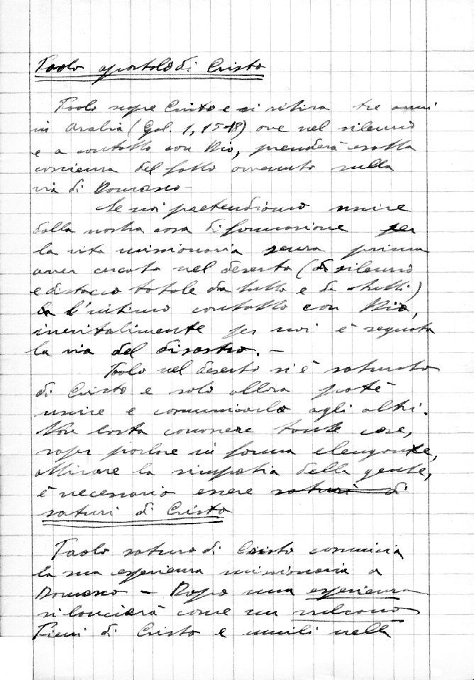 Paolo scopre Cristo e si ritira tre anni in Arabia (Gal. 1,15-18), ove nel silenzio e a contatto con Dio, prenderà esatta coscienza del fatto avvenuto sulla via di Damasco. Se noi pretendiamo di uscire dalla nostra casa di formazione per la vita missionaria senza prima aver cercato nel deserto (silenzio e distacco totale da tutto e da tutti) l’intimo contatto con Dio, inevitabilmente per noi è segnata la via del disastro. Paolo nel deserto si è saturato di Cristo e solo allora poté uscire e comunicarlo agli altri. Non basta conoscere tante cose, saper parlare in forma elegante, attirare la simpatia della gente: è necessario essere saturi di Cristo. Paolo, saturo di Cristo, comincia la sua esperienza missionaria a Damasco. Dopo una esperienza si lancerà come un vulcano. Pieni di Cristo e umili nella prima esperienza apostolica... Non presunzione, non essere facilitoni...