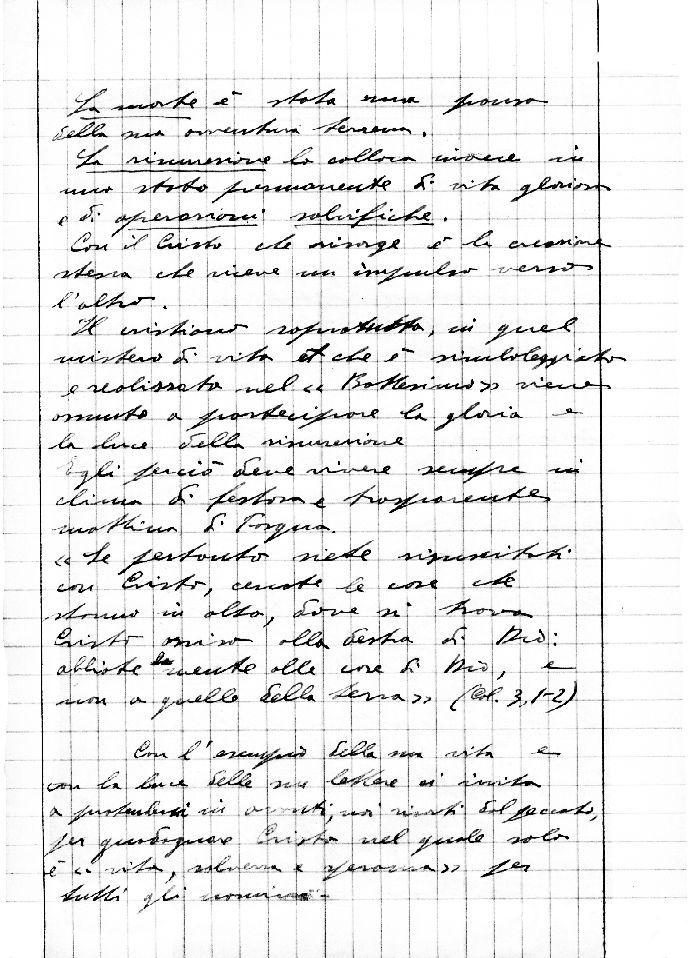 II cristiano, soprattutto in quel mistero di vita che è simboleggiato e realizzato nel “Battesimo”, viene assunto a partecipare alla gloria e alla luce della risurrezione. Egli perciò deve vivere sempre in clima di festosa e trasparente mattina di Pasqua. “Se pertanto siete risuscitati con Cristo, cercate le cose di lassù, dove si trova Cristo assiso alla destra di Dio; abbiate la mente alle cose di Dio, e non a quelle della terra” (Col. 3,1-2). Con l’esempio della sua vita e con la luce delle sue lettere ci invita a protenderci in avanti, noi risorti dal peccato, per guadagnare Cristo nel quale solo è “vita, salvezza e speranza” per tutti gli uomini.
