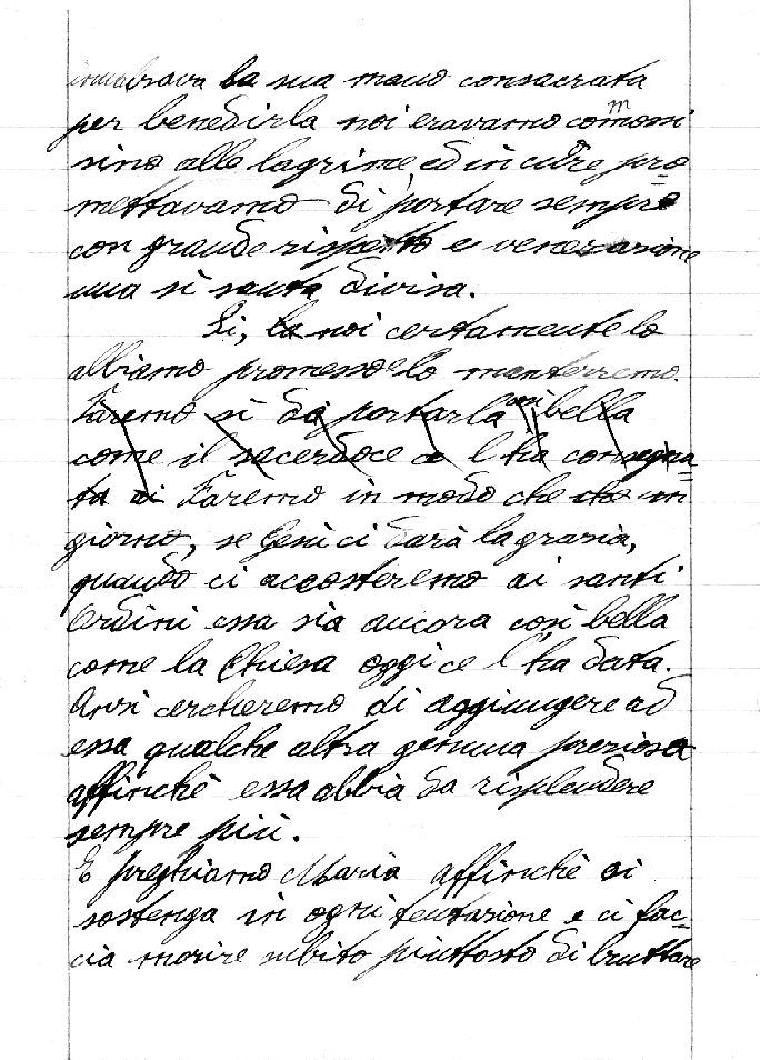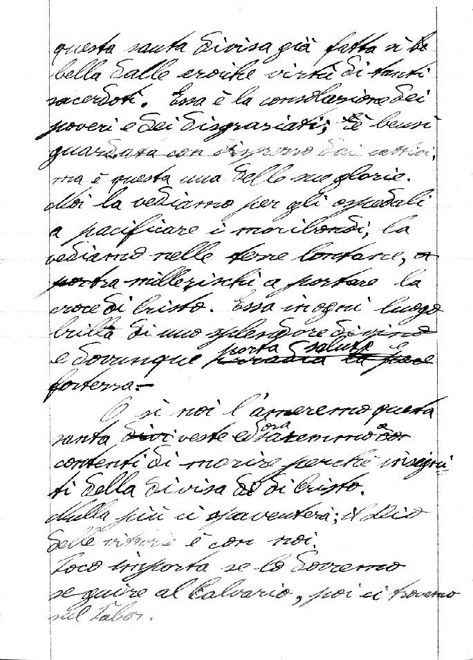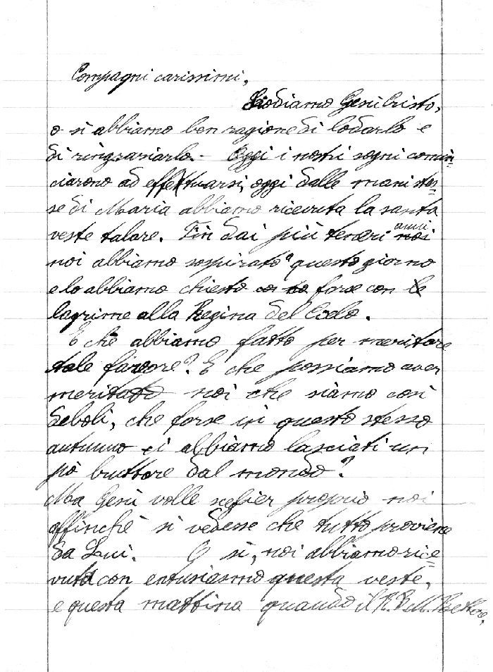 1.Compagni carissimi. Lodiamo Gesù Cristo. Oh, sì, abbiamo ben ragione di lodarlo e di ringraziarlo. Oggi i nostri sogni cominciano ad effettuarsi, oggi dalle mani stesse di Maria abbiamo ricevuta la santa veste talare. Fin dai più teneri anni noi abbiamo sospirato questo giorno e lo abbiamo chiesto forse con lagrime alla Regina del Cielo. E che abbiamo fatto per meritare tale favore? E che possiamo aver meritato noi, che siamo così deboli, che forse in questo stesso autunno ci siamo lasciati un po’ bruttare dal mondo? Ma Gesù volle scegliere proprio noi, affinché si vedesse che tutto proviene da Lui. Oh, sì, noi abbiamo ricevuto con entusiasmo questa veste, e questa mattina quando il Rev. Mons. Rettore innalzava la sua mano consacrata per benedirla, noi eravamo commossi fina alle lagrime ed in cuore promettevamo di portare sempre con grande rispetto e venerazione una sì santa divisa.SACERDOZIO prete