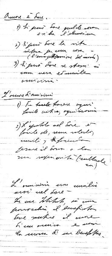 2 Amare è dare. 1) Si può dare qualche cosa e si ha l’elemosina. 2) Si può dare la vita intera per una cosa: l’evangelizzazione del mondo. 3) Si può dare se stessi in una vera ed umile amicizia. L’amore di amicizia. 1) Fa tacere ogni facile critica, ogni ironia. 2) L’apostolo nel dare è facile che, senza volerlo, umíli, facendo pesare il dono o la sua superiorità culturale, ecc. L’amicizia non umilia mai nel dare. In un Istituto, in una parrocchia, il beneficato deve sentire il cuore di un amico e non la mano di un benefattore.CARITÀ
