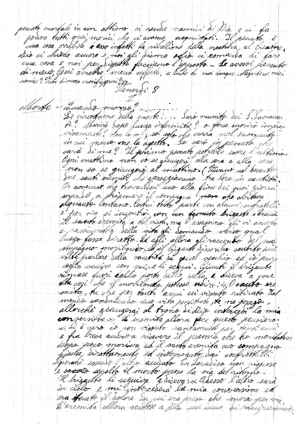 Le circostanze della morte... Riceverò i SS. Sacramenti? Morirò dopo una lunga infermità? O forse morirò improvvisamente? Non lo so; so solo che verrà nel momento in cui meno me la aspetto. Se sarò in peccato, che sarà di me? Il primo peccato potrebbe essere l’ultimo. Ogni mattino non so se giungerò alla sera e alla sera non so se giungerò al mattino. Vivevano nel deserto due santi eremiti che gareggiavano tra toro in santità. Or avvenne che, trovandosi uno alla fine del suoi giorni, mandò a chiamare il compagno che abitava alquanto lontano. Costui subito parte con alcuni confratelli e per via si incontrò con un temuto brigante. Tremò il santo eremita a tal vista, ma l’assassino gli si accostò e, rassicuratolo della vita, gli domandò verso quale luogo fosse diretto. Ed egli allora gli raccontò del suo compagno moribondo, ed il brigante gli disse: “Ho sentito più volte parlare della santità di quel vecchio ed io pure voglio venire con voi”, e li seguì. Giunti presso l’ammalato, il brigante rimase fuori dalla porta della cella e diceva a voce alta, così che il moribondo potesse udire: “O santo eremita, tu che per tanti anni sei vissuto ritirato dal mondo conducendo una vita penitente, te ne prego, allorché giungerai al trono di Dio, intercedi la mia conversione”. L’eremita allora fece questo pensiero: “Sì, è vero, io sono vissuto santamente per tanti anni e fra breve andrò a ricevere il premio che ho meritato". Poco dopo moriva, ed il santo eremita suo compagno pianse dirottamente, ed interrogato dai confratelli sul perché, essendo l’altro andato in Paradiso, non rispose. Sepolto il morto, prese la via del ritorno. Il brigante li seguiva e diceva: “Adesso l’altro sarà in cielo e intercederà la mia conversione”; ed era tanto il dolore da cui era preso che morì per via. L’eremita allora sciolse a Dio un inno di ringraziamento. Dissero allora i confratelli: “Padre, poco fa è morto un santo e voi avete pianto, invece di godere perché egli è salito al Paradiso; ora invece che muore un infame assassino, voi rendete gloria al Signore”. Ed egli allora: “Il Dio della giustizia mi ha concesso la grazia di vedere la fine di queste due anime. L’anima dell’eremita, per un pensiero di superbia fatto negli ultimi momenti, andava all’inferno; mentre la seconda, per il vero pentimento del suoi peccati, andava in Paradiso”. Il primo peccato non potrebbe essere anche per noi l’ultimo?...