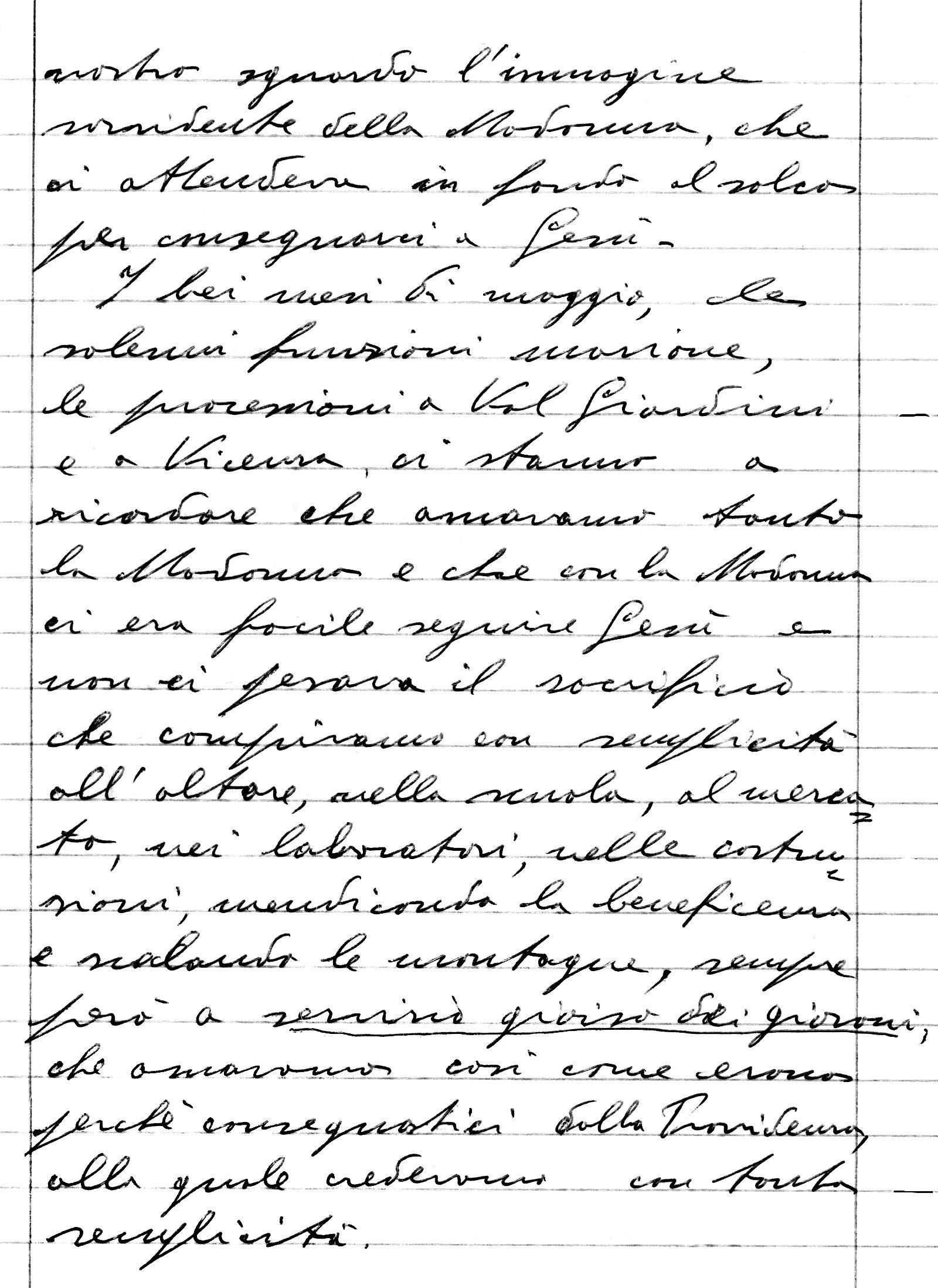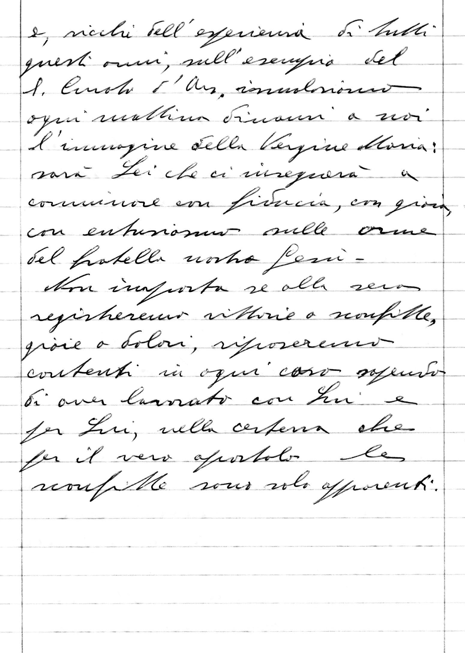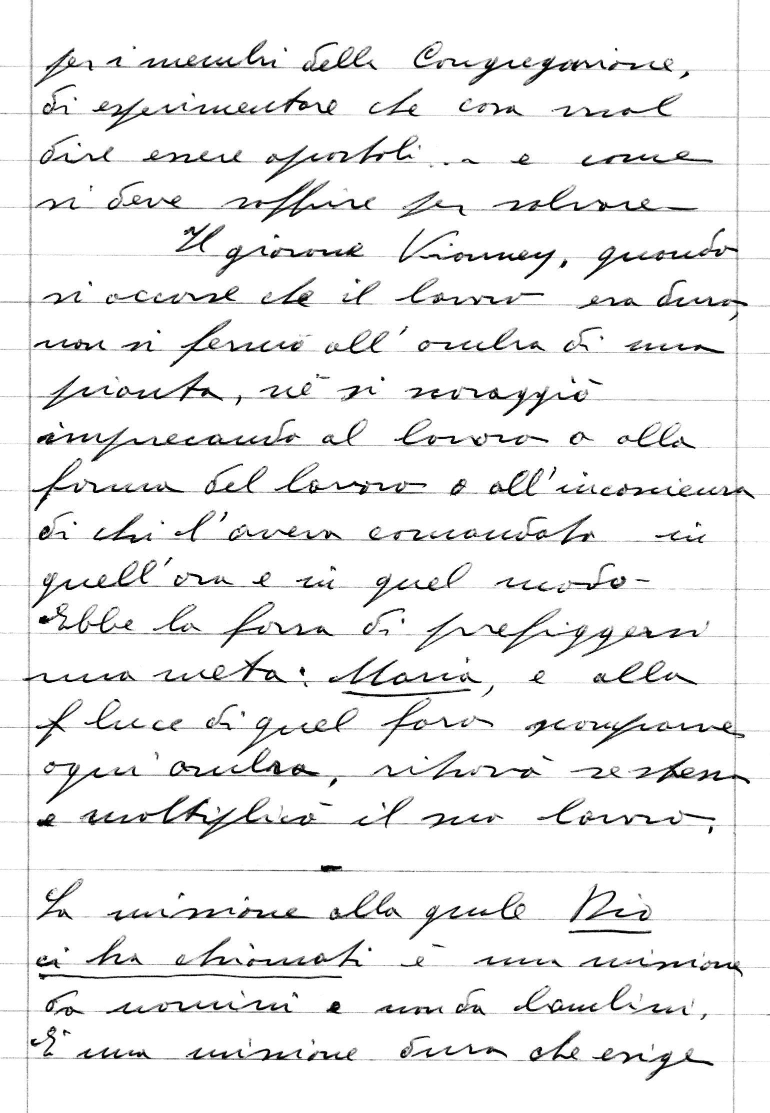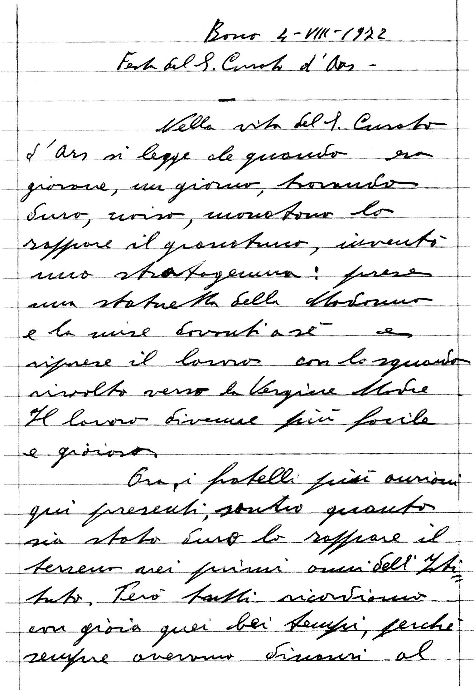 1 Nella vita del Santo Curato d'Ars si legge che quando era giovane, un giorno, trovando duro, noioso, monotono lo zappare il granoturco, inventò uno stratagemma: prese una statuetta della Madonna e la mise davanti a sé e riprese il lavoro con lo sguardo rivolto verso la Vergine Madre. Il lavoro divenne più facile e gioioso.Ora, i fratelli più anziani qui presenti sanno quanto sia stato duro lo zappare il terreno nei primi anni dell'Istituto. Però tutti ricordiamo con gioia quei bei tempi, perché sempre avevamo dinanzi al nostro sguardo l'immagine sorridente della Madonna che ci attendeva in fondo al solco per consegnarci a Gesù.I bei mesi di maggio, le solenni funzioni mariane, le processioni a Val Giardini e a Vicenza, ci stanno a ricordare che amavamo tanto la Madonna e che con la Madonna ci era facile seguire Gesù e non ci pesava il sacrificio che compivamo con semplicità all'altare, nella scuola, al mercato, nei laboratori, nelle costruzioni, mendicando la beneficenza e scalando le montagne, sempre però a servizio gioioso dei giovani, che amavamo così come erano perché consegnatici dalla Provvidenza, alla quale credevamo con tanta semplicità.In quei tempi ci sembrava tutto facile: facile il pregarefacile il ricominciare ogni giorno la salita verso Diofacile il lasciarci guidare dal Padre Spiritualefacile il dimenticarci per amarefacile persino il rinunciare alla gioia del proprio lavoro.Eravamo all'aurora della nostra famiglia religiosa, e col fresco del mattino, con l'entusiasmo giovanile e con la gioia delle realizzazioni, era facile sostenerci e camminare.Allora credevamo che bastasse presentarsi ai fratelli perché gli altri venissero con noi.Adesso si è alzato il sole ed il lavoro comincia ad essere duro e pesante. È arrivata l'ora, per i membri della Congregazione, di esperimentare che cosa vuol dire essere apostoli... e come si deve soffrire per salvare.Il giovane Vianney, quando si accorse che il lavoro era duro, non si fermò all'ombra di una pianta, né si scoraggiò imprecando al lavoro o alla forma del lavoro o all'incoscienza di chi l'aveva comandato in quell'ora e in quel modo. Ebbe la forza di prefiggersi una meta: Maria , e alla luce di quel faro scomparve ogni ombra, ritrovò se stesso e moltiplicò il suo lavoro.La missione alla quale Dio ci ha chiamati è una missione da uomini e non da bambini. È una missione dura che esige spirito di sacrificio non comune e costanza nell'azione. Mentre con la tecnica moderna viene ridotto lo sforzo per il lavoro dell'uomo, per la nostra santificazione e per l'apostolato non ci sono ascensori o aviogetti, ma siamo e saremo sempre al livello delle dure scalate che fanno sudare e sanguinare. L'apostolo pertanto, se vuole essere autentico, non deve essere preoccupato di gridare contro gli ostacoli, ma, da vero uomo di Dio, li deve accettare e superare con gioia, raccogliendo ogni goccia di sangue, che servirà per lavare il proprio peccato e quello dei fratelli.Torniamo con semplicità ai primi tempi dell'Istituto e, ricchi dell'esperienza di tutti questi anni, sull'esempio del Santo Curato d'Ars, innalziamo ogni mattina dinanzi a noi l'immagine della Vergine Maria: sarà lei che ci insegnerà a camminare con fiducia, con gioia, con entusiasmo sulle orme del fratello nostro Gesù.Non importa se alla sera registreremo vittorie o sconfitte, gioie o dolori; riposeremo contenti in ogni caso, sapendo di aver lavorato con Lui e per Lui, nella certezza che per il vero apostolo le sconfitte sono solo apparenti.