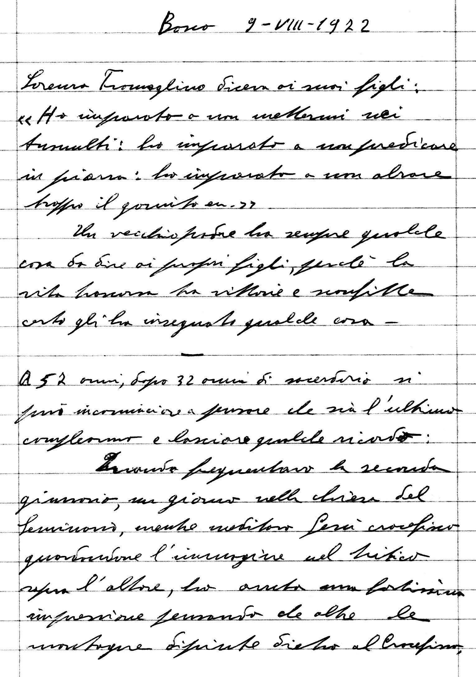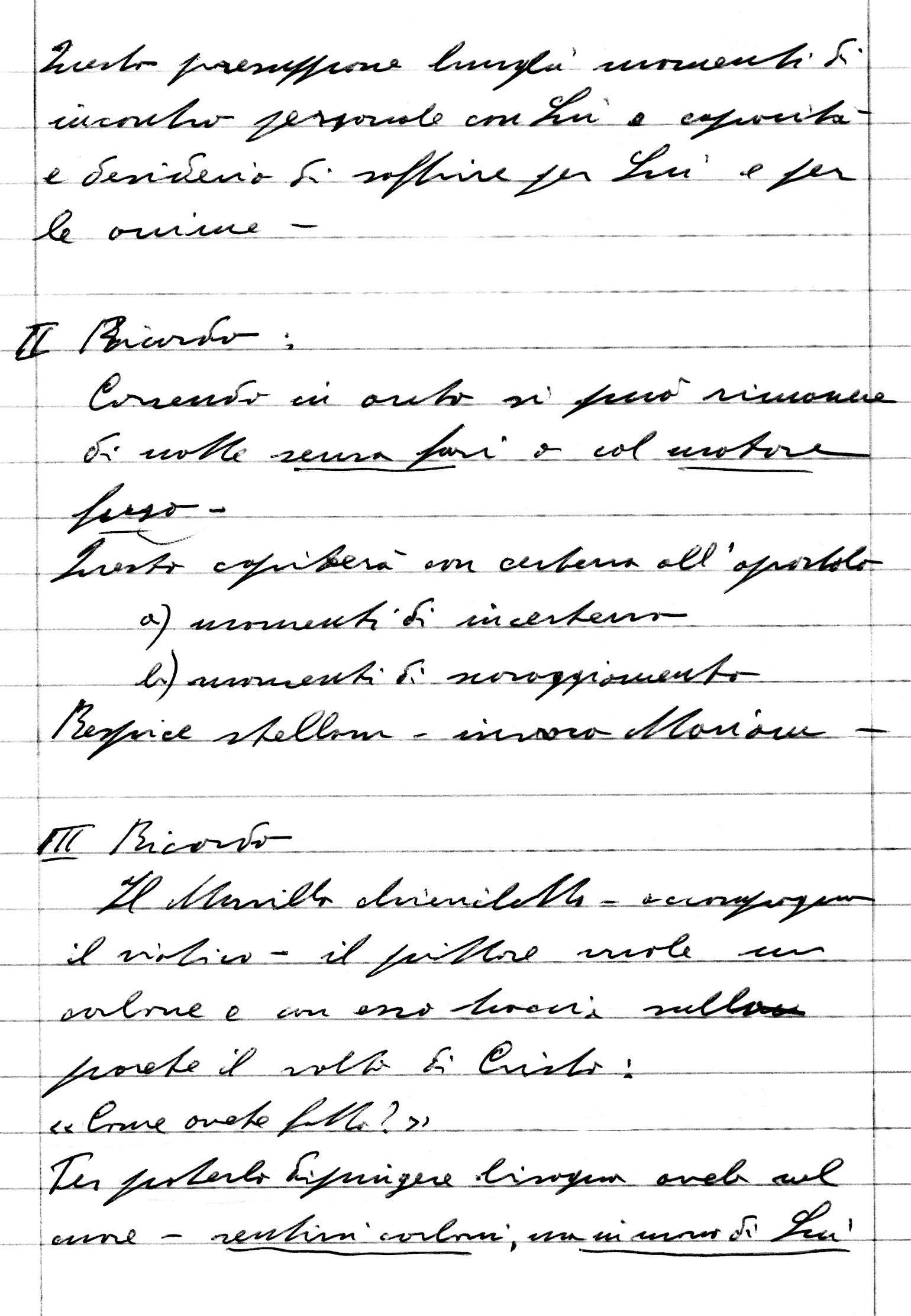 1 Lorenzo Tramaglino diceva ai suoi figli: «Ho imparato a non mettermi nei tumulti, ho imparato a non predicare in piazza, ho imparato a non alzare troppo il gomito...».Un vecchio padre ha sempre qualche cosa da dire ai propri figli, perché la vita trascorsa tra vittorie e sconfitte certo gli ha insegnato qualche cosa.A cinquantasette anni, dopo trentadue anni di sacerdozio, si può incominciare a pensare che sia l'ultimo compleanno e lasciare qualche ricordo.Quando frequentavo la seconda ginnasio, un giorno nella chiesa del seminario, mentre meditavo Gesù crocifisso guardandone l'immagine nel trittico sopra l'altare, ho avuto una fortissima impressione pensando che, oltre le montagne dipinte dietro al Crocifisso, c'era il mondo che non conosceva e non amava Lui. Perciò mi ha sempre sostenuto una sola idea: farlo conoscere e farlo amare. Divenne pertanto secondario tutto il resto:Le difficoltà della vita in seminario.La comunità che avrei trovato nella canonica ove il vescovo mi avrebbe mandato.Il luogo e il campo di lavoro che mi sarebbero stati assegnati (vecchi, giovani, carcerati, ammalati, città, montagna, eccetera).1° RICORDODa ciò mi permetto di formulare il primo ricordo. Abbiate un ideale solo, ma grande, divampante, capace di sostenere la vostra vita in ogni circostanza: far conoscere Lui e farlo amare. Dove? Come? Con chi? Non importa. Questo presuppone lunghi momenti di incontro personale con Lui e capacità e desiderio di soffrire per Lui e per le anime.2° RICORDOCorrendo in auto si può rimanere di notte senza fari o con il motore fuso. Questo capiterà con certezza all'apostolo:momenti di incertezzamomenti di scoraggiamento«Respice stellam, invoca Mariam». 3° RICORDOIl Murillo, chierichetto, accompagna il viatico. Il pittore vuole un carbone e con esso traccia sulla parete il volto di Cristo: «Come avete fatto?». «Per poterlo dipingere bisogna averlo nel cuore». Sentirsi carboni, ma in mano di Lui. 9 agosto 1972 CRISTO AMICO1 ) Gesù dev'essere per me un amico così caro e amato che devo conversare con Lui di ogni cosa; ne parlo a Lui, gli chiedo il suo aiuto, faccio ogni cosa con Lui... Il termometro per sapere se Cristo per me è un amico che mi interessa, che amo, è questo: mi domando: Oggi, o in quell'occasione, ho agito per farmi vedere, per gli altri o per Lui? Mi interessa che sia contento Lui di me, o cerco l'approvazione di altri? Se lo amo mi basta che sia contento Lui.2) Per diventare sempre più amici di Cristo, la strada è meditare sul Crocifisso, sulla Passione: se Cristo mi ha amato così, come posso non amarlo? Contemplandolo crocifisso, sentirò il bisogno di spogliarmi di me stesso, mi sentirò peccatore, bisognoso di perdono... Il passo per amare Cristo lo devo fare io: non lo fa nessun altro al mio posto. Nei momenti difficili in cui non ho voglia di pregare, devo reagire pregando di più. Se mi accorgo che non faccio qualche pratica di pietà, devo farla più spesso e più a lungo...AUTOBIOGRAFIA